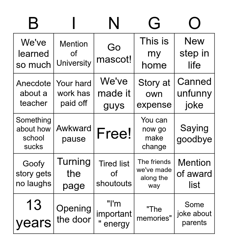 This bingo card has a free space and 24 words: Turning the page, Opening the door, We've made it guys, 13 years, New step in life, We've learned so much, Anecdote about a teacher, Mention of University, You can now go make change, Tired list of shoutouts, Story at own expense, Something about how school sucks, The friends we've made along the way, Mention of award list, Your hard work has paid off, "The memories", Saying goodbye, Go mascot!, Canned unfunny joke, Awkward pause, Some joke about parents, Goofy story gets no laughs, This is my home and "I'm important " energy.