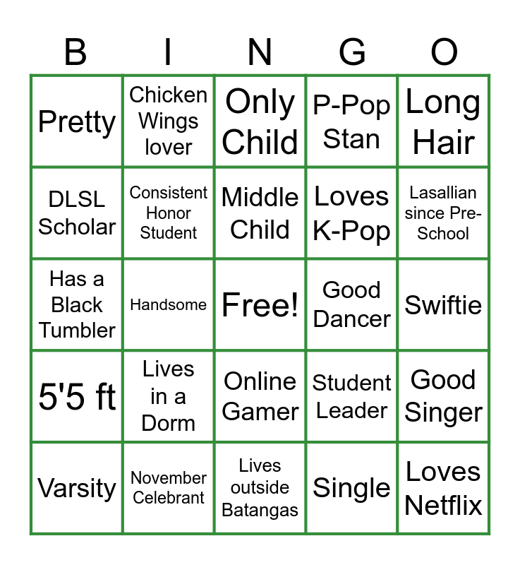 This bingo card has a free space and 24 words: Lives in a Dorm, November Celebrant, Middle Child, Varsity, Long Hair, Pretty, DLSL Scholar, Chicken Wings lover, Good Dancer, Online Gamer, Loves K-Pop, Has a Black Tumbler, Student Leader, Good Singer, Consistent Honor Student, Single, Swiftie, Only Child, Lasallian since Pre-School, Handsome, Loves Netflix, 5'5 ft, P-Pop Stan and Lives outside Batangas.