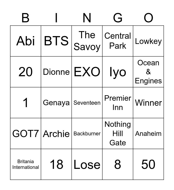 This bingo card has a free space and 24 words: Archie, 18, EXO, Britania International, Lowkey, Abi, 20, BTS, Premier Inn, Backburner, Iyo, 1, Nothing Hill Gate, Anaheim, Dionne, 8, Winner, The Savoy, Ocean & Engines, Genaya, 50, GOT7, Central Park and Lose.