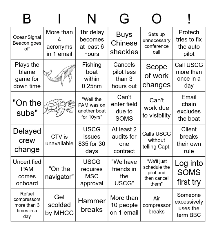 This bingo card has 2 images and 34 words: "We have friends in the USCG", USCG requires MSC approval, More than 10 people on 1 email, Plays the blame game for down time, Delayed crew change, Can't enter field due to SOMS, Hammer breaks, Sets up unnecessary conference call, "We'll just schedule the pilot and then cancel them", Call USCG more than once in a day, Buys Chinese shackles, Log into SOMS first try, Cancels pilot less than 3 hours out, OceanSignal Beacon goes off, Uncertified PAM comes onboard, Can't work due to visibility, "On the subs", 1hr delay becomes at least 6 hours, "Well the PAM was on another boat for 10yrs", CTV is unavailable, At least 2 audits for one contract, USCG issues 835 for 30 days, Calls USCG without telling Capt., More than 4 acronyms in 1 email, Scope of work changes, Get scolded by MHCC, Fishing boat within 0.25nm, Protech tries to fix the auto pilot, Someone excessively uses the term BBC, Refuel compressors more than 3 times in a day, Client breaks their own rule, Email chain excludes the boat, "On the navigator" and Air compressor breaks.