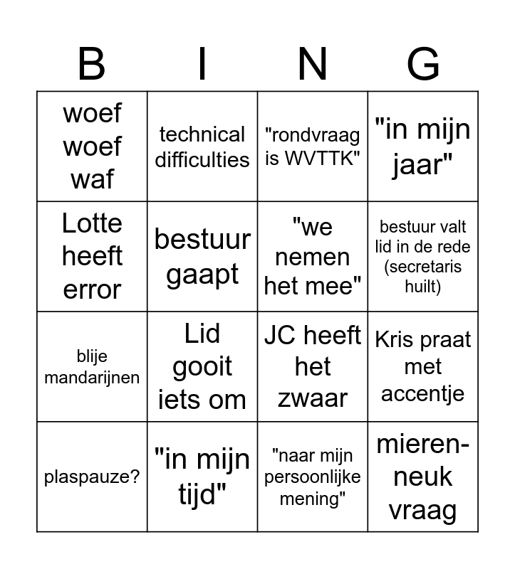 This bingo card has 16 words: "in mijn tijd", Kris praat met accentje, "rondvraag is WVTTK", woef woef waf, blije mandarijnen, technical difficulties, JC heeft het zwaar, "naar mijn persoonlijke mening", Lotte heeft error, bestuur gaapt, plaspauze?, "in mijn jaar", Lid gooit iets om, bestuur valt lid in de rede (secretaris huilt), "we nemen het mee" and mieren-neuk vraag.