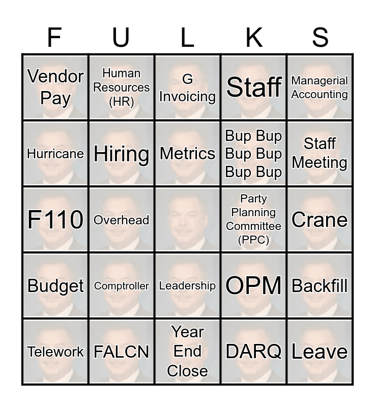 This bingo card has 24 images, a free space and 24 words: Comptroller, FALCN, Metrics, Telework, Managerial Accounting, Vendor Pay, Hurricane, Human Resources (HR), Party Planning Committee (PPC), Leadership, Bup Bup Bup Bup Bup Bup, F110, OPM, Backfill, Hiring, DARQ, Crane, G Invoicing, Staff Meeting, Overhead, Leave, Budget, Staff and Year End Close.