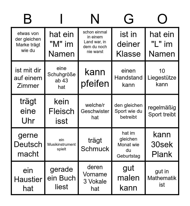 This bingo card has a free space and 29 words: ein Haustier hat, die gleiche Augenfarbe hat wie du, kein Fleisch isst, im gleichen Monat Geburtstag hat wie du, etwas von der gleichen Marke trägt wie du, schon einmal in einem Land war, in dem du noch nie warst, eine Schuhgröße ab 43 hat, ein Musikinstrument spielt, den gleichen Sport wie du betreibt, gerade ein Buch liest, regelmäßig Sport treibt, gut in Mathematik ist, deren Vorname 3 Vokale hat, gut malen kann, 10 Liegestütze kann, gerne Musik hört, trägt Schmuck, gerne Deutsch macht, hat ein "L" im Namen, trägt eine Uhr, hat im gleichen Monat wie du Geburtstag, bis 10 zählen kann auf einer anderen Sprache, einen Handstand kann, ist mit dir auf einem Zimmer, ist in deiner Klasse, hat ein "M" im Namen, kann 30sek Plank, kann pfeifen and mag Eis.