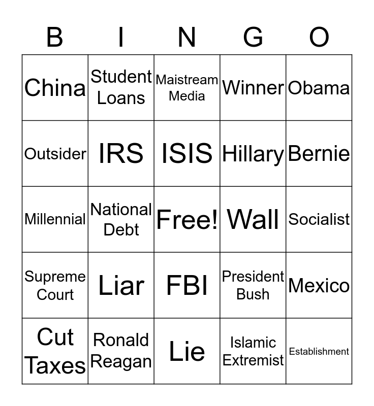 This bingo card has a free space and 24 words: Liar, Ronald Reagan, ISIS, Cut Taxes, Obama, China, Outsider, Student Loans, Wall, FBI, Hillary, Millennial, President Bush, Mexico, IRS, Islamic Extremist, Socialist, Maistream Media, Bernie, National Debt, Establishment, Supreme Court, Winner and Lie.