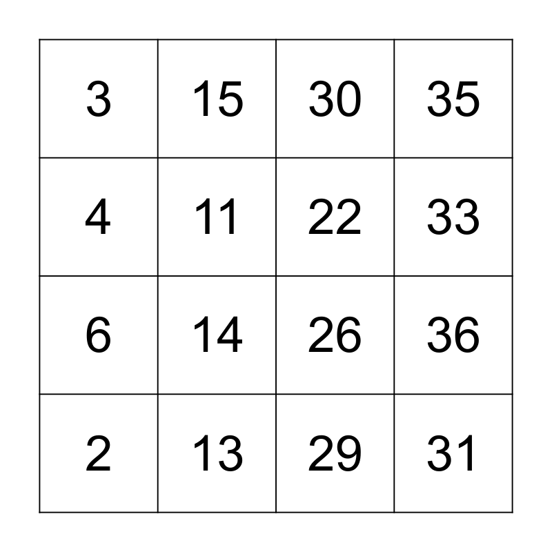 This bingo card has 40 words: 1, 11, 21, 31, 2, 12, 22, 32, 3, 13, 23, 33, 4, 14, 24, 34, 5, 15, 25, 35, 6, 16, 26, 36, 7, 17, 27, 37, 8, 18, 28, 38, 9, 19, 29, 39, 10, 20, 30 and 40.
