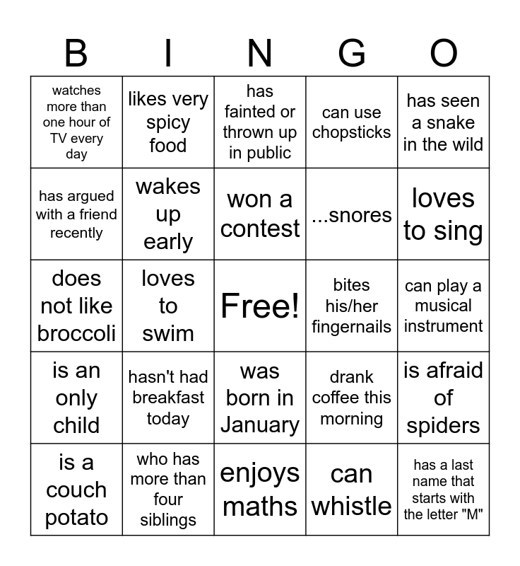 This bingo card has a free space and 25 words: hasn't had breakfast today, enjoys maths, won a contest, is a couch potato, has seen a snake in the wild, watches more than one hour of TV every day, has argued with a friend recently, likes very spicy food, bites his/her fingernails, was born in January, ...snores, does not like broccoli, drank coffee this morning, is afraid of spiders, wakes up early, wears socks to bed, can play a musical instrument, has fainted or thrown up in public, loves to sing, loves to swim, has a last name that starts with the letter "M", who has more than four siblings, is an only child, can use chopsticks and can whistle.