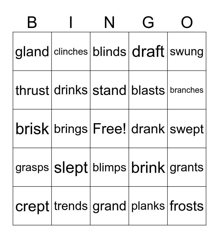 This bingo card has a free space and 38 words: blanks, brand, crusts, drinks, grants, slept, stand, trust, swung, blasts, brings, draft, frosts, swept, thrust, grasps, spent, blinds, crafts, drank, gland, trends, branches, crept, drift, grand, swings, trunks, flunk, shrunk, shrimp, blimps, planks, clinches, clamps, brink, brisk and scalp.