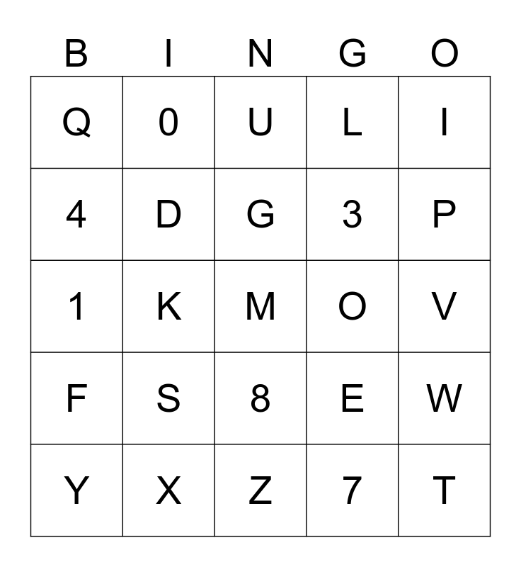 This bingo card has a free space and 36 words: A, B, C, D, E, F, G, H, I, J, K, L, N, O, P, Q, R, S, T, U, V, W, X, Y, Z, 0, 1, 2, 3, 4, 5, 6, 7, 8, 9 and 10.