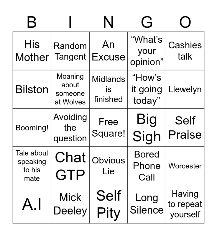 This bingo card has a free space and 24 words: Chat GTP, Mick Deeley, Midlands is finished, A.I, Cashies talk, His Mother, Bilston, Random Tangent, Big Sigh, Obvious Lie, “How’s it going today”, Booming!, Bored Phone Call, Worcester, Moaning about someone at Wolves, Long Silence, Self Praise, An Excuse, Llewelyn, Avoiding the question, Having to repeat yourself, Tale about speaking to his mate, “What’s your opinion” and Self Pity.