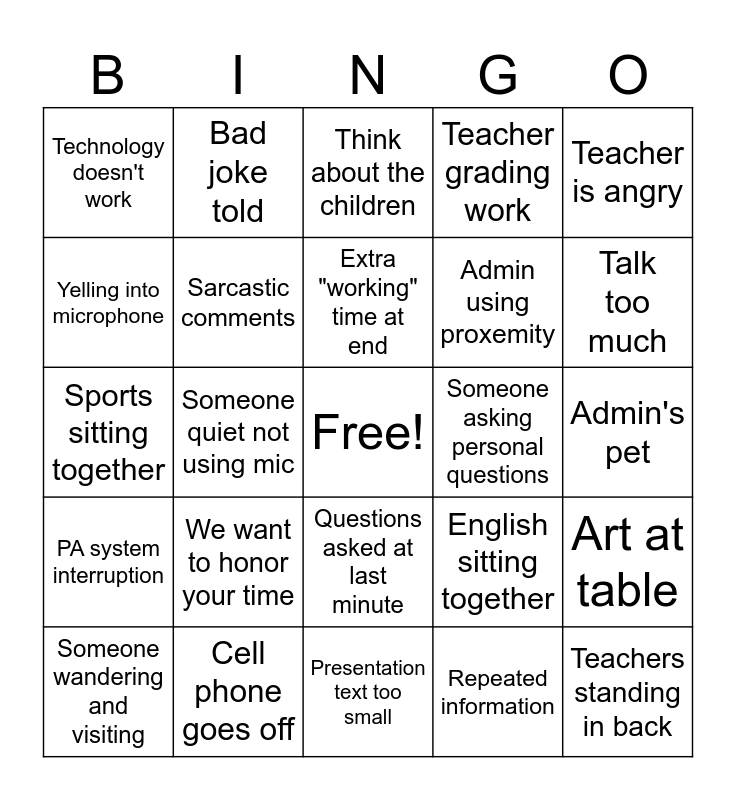This bingo card has a free space and 24 words: We want to honor your time, Cell phone goes off, Extra "working" time at end, Someone wandering and visiting, Teacher is angry, Technology doesn't work, Yelling into microphone, Bad joke told, Someone asking personal questions, Questions asked at last minute, Admin using proxemity, Sports sitting together, English sitting together, Art at table, Sarcastic comments, Repeated information, Admin's pet, Think about the children, Talk too much, Someone quiet not using mic, Teachers standing in back, PA system interruption, Teacher grading work and Presentation text too small.