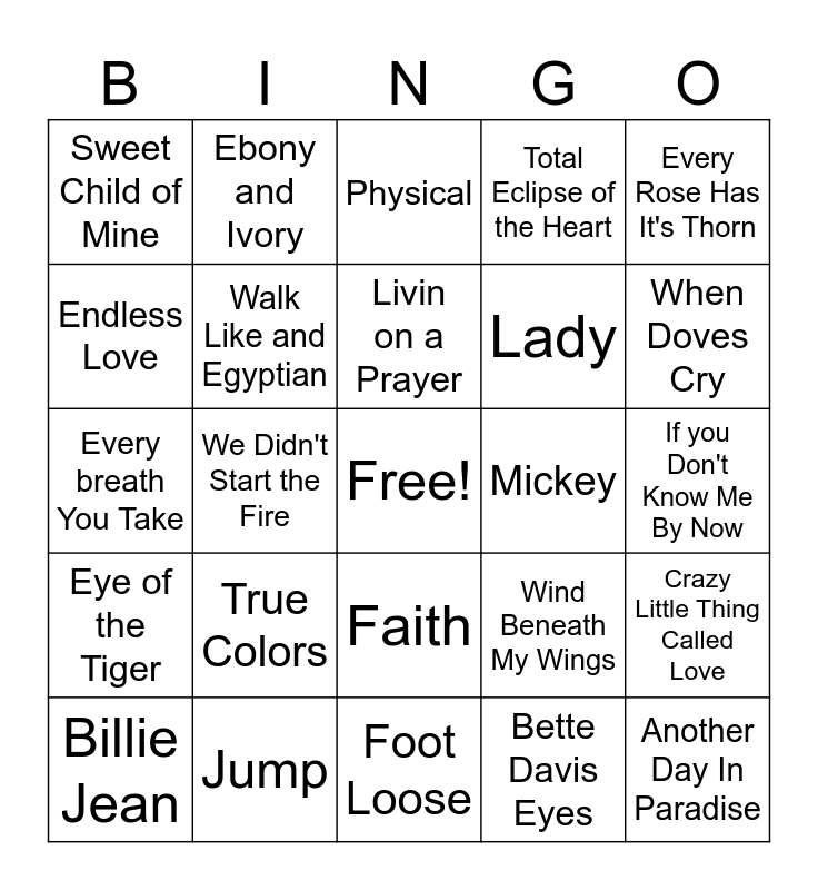 This bingo card has a free space and 28 words: Crazy Little Thing Called Love, Call Me, Lady, Bette Davis Eyes, Endless Love, Physical, Ebony and Ivory, Eye of the Tiger, Mickey, Billie Jean, Every breath You Take, Total Eclipse of the Heart, Jump, Foot Loose, When Doves Cry, Ghostbusters, True Colors, Walk Like and Egyptian, Livin on a Prayer, Faith, Sweet Child of Mine, Don't Worry Be Happy, Another Day In Paradise, We Didn't Start the Fire, If you Don't Know Me By Now, Wind Beneath My Wings, Every Rose Has It's Thorn and Like a Virgin.