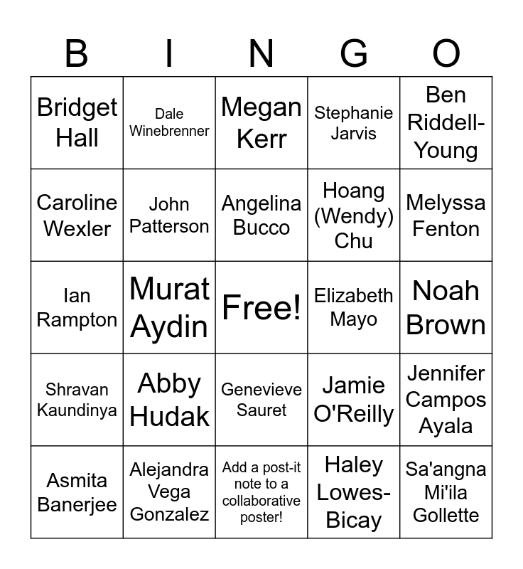 This bingo card has a free space and 24 words: Abby Hudak, Alejandra Vega Gonzalez, Angelina Bucco, Asmita Banerjee, Ben Riddell-Young, Bridget Hall, Caroline Wexler, Dale Winebrenner, Elizabeth Mayo, Genevieve Sauret, Hoang (Wendy) Chu, Ian Rampton, Jamie O'Reilly, Jennifer Campos Ayala, John Patterson, Haley Lowes-Bicay, Noah Brown, Megan Kerr, Melyssa Fenton, Murat Aydin, Sa'angna Mi'ila Gollette, Shravan Kaundinya, Stephanie Jarvis and Add a post-it note to a collaborative poster!.