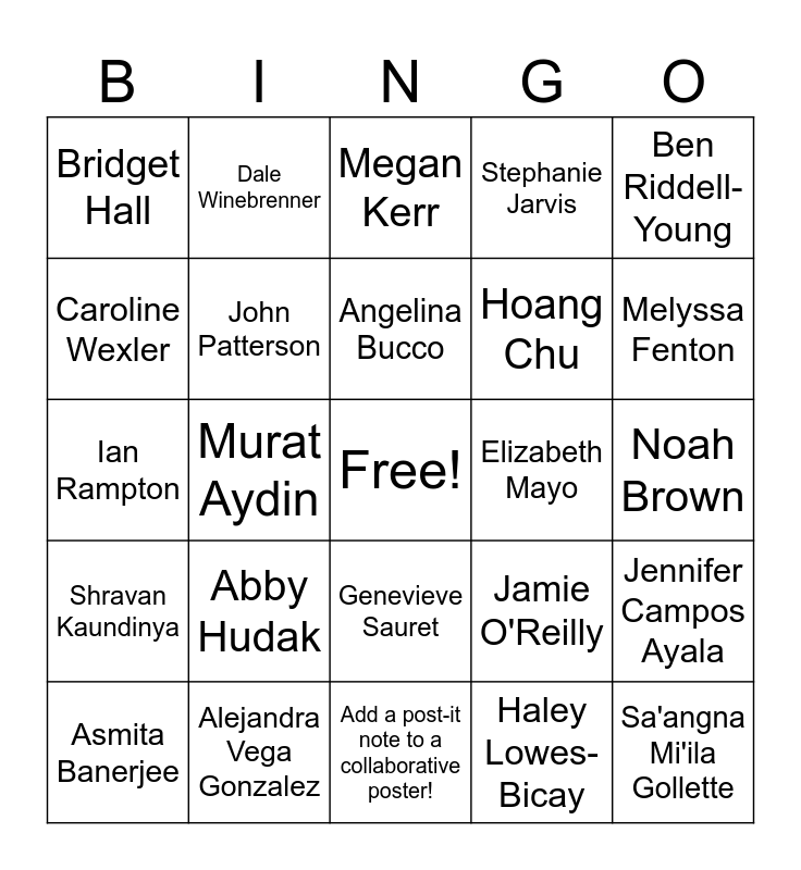 This bingo card has a free space and 24 words: Abby Hudak, Alejandra Vega Gonzalez, Angelina Bucco, Asmita Banerjee, Ben Riddell-Young, Bridget Hall, Caroline Wexler, Dale Winebrenner, Elizabeth Mayo, Genevieve Sauret, Hoang Chu, Ian Rampton, Jamie O'Reilly, Jennifer Campos Ayala, John Patterson, Haley Lowes-Bicay, Noah Brown, Megan Kerr, Melyssa Fenton, Murat Aydin, Sa'angna Mi'ila Gollette, Shravan Kaundinya, Stephanie Jarvis and Add a post-it note to a collaborative poster!.