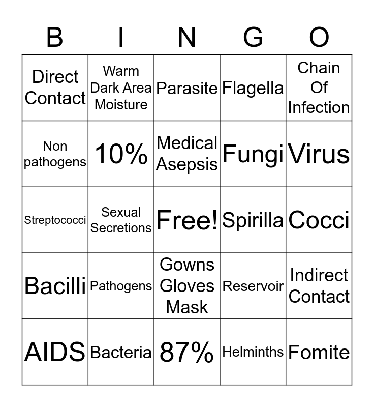 This bingo card has a free space and 24 words: Pathogens, Bacteria, Medical Asepsis, AIDS, Chain Of Infection, Direct Contact, Non pathogens, Warm Dark Area Moisture, Spirilla, Gowns Gloves Mask, Fungi, Streptococci, Reservoir, Indirect Contact, 10%, Helminths, Cocci, Parasite, Virus, Sexual Secretions, Fomite, Bacilli, Flagella and 87%.
