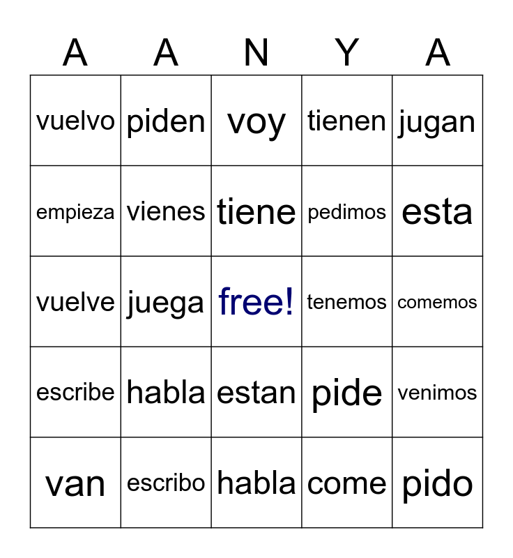 This bingo card has a free space and 24 words: habla, escribo, tiene, van, jugan, vuelvo, empieza, piden, tenemos, estan, pedimos, vuelve, pide, venimos, vienes, come, comemos, voy, esta, juega, pido, escribe, tienen and habla.
