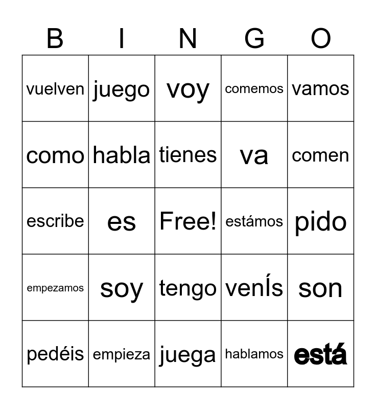 This bingo card has a free space and 24 words: soy, empieza, tienes, pedéis, vamos, vuelven, como, juego, estámos, tengo, va, escribe, venÍs, son, habla, hablamos, pido, voy, comen, es, está, empezamos, comemos and juega.