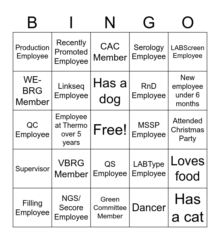 This bingo card has a free space and 24 words: VBRG Member, NGS/ Secore Employee, Has a dog, Filling Employee, LABScreen Employee, Production Employee, WE-BRG Member, Recently Promoted Employee, MSSP Employee, QS Employee, RnD Employee, QC Employee, LABType Employee, Loves food, Linkseq Employee, Dancer, Attended Christmas Party, CAC Member, New employee under 6 months, Employee at Thermo over 5 years, Has a cat, Supervisor, Serology Employee and Green Committee Member.