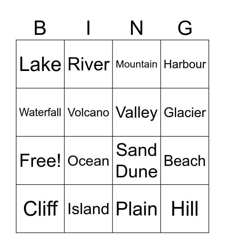 This bingo card has 20 words: Beach, Canal, Mountain, Cave, Cliff, Waterfall, Island, Lake, Free!, River, Ocean, Sand Dune, Volcano, Hill, Valley, Plateau, Glacier, Harbour, Plain and Canyon.