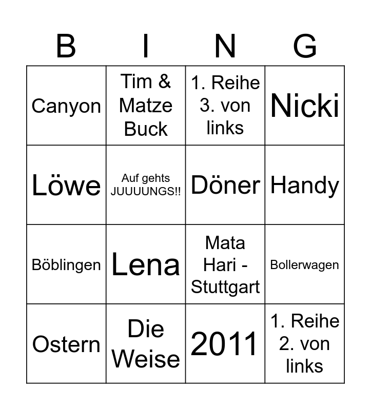This bingo card has 26 words: Free!, YouTube - Piano Karriere, Handy, 178,2 cm, Löwe, Canyon, Auf gehts JUUUUNGS!!, Tim & Matze Buck, 2011, Suhl, Böblingen, Mata Hari - Stuttgart, 68.291, Stuttgart, Bollerwagen, Buck, Nicki, 1. Reihe 2. von links, 1. Reihe 3. von links, Ostern, Lena, 3,14159 bar, Die Weise, Geschenk Gottes, Döner and Steinbock.