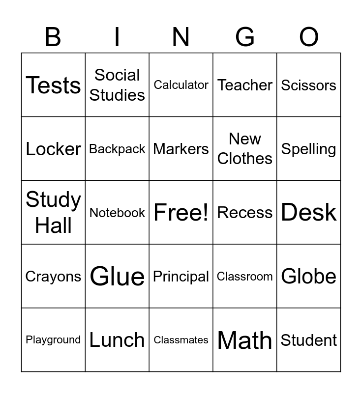 This bingo card has a free space and 37 words: Lunch Box, Apple, Eraser, Backpack, Globe, Glue, Markers, Highlighters, Scissors, School Bus, Notebook, Teacher, Student, Desk, Locker, Crayons, Pencil, Calculator, Principal, Recess, Tests, Spelling, Playground, Classmates, Music, Math, Social Studies, Science, Phys Ed, Reading, Library, Lunch, Study Hall, Report Cards, Classroom, New Clothes and Friends.