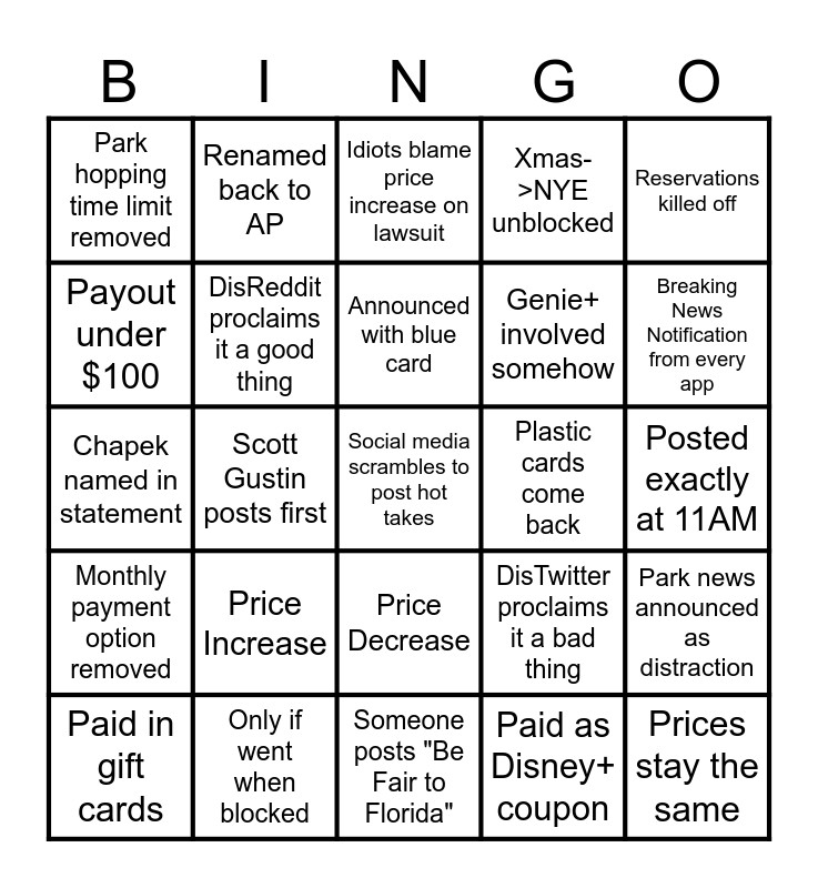 This bingo card has a free space and 24 words: Price Increase, Only if went when blocked, Announced with blue card, Paid in gift cards, Reservations killed off, Park hopping time limit removed, Payout under $100, Renamed back to AP, Plastic cards come back, Price Decrease, Genie+ involved somehow, Chapek named in statement, DisTwitter proclaims it a bad thing, Park news announced as distraction, DisReddit proclaims it a good thing, Paid as Disney+ coupon, Posted exactly at 11AM, Idiots blame price increase on lawsuit, Breaking News Notification from every app, Scott Gustin posts first, Prices stay the same, Monthly payment option removed, Xmas->NYE unblocked and Someone posts "Be Fair to Florida".