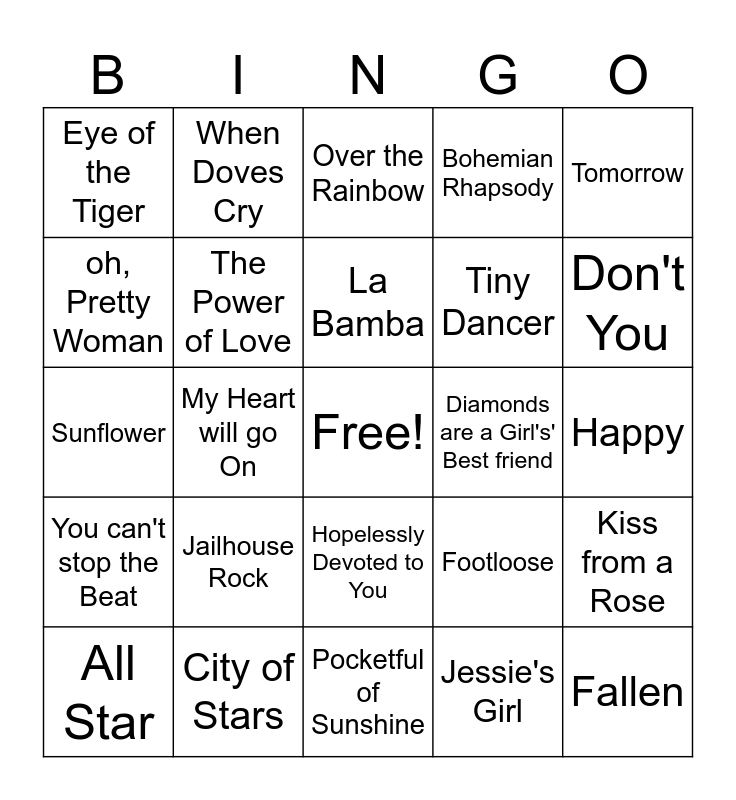 This bingo card has a free space and 29 words: All Star, When We're Human, My Heart will go On, Shallow, Eye of the Tiger, Over the Rainbow, The Power of Love, Jailhouse Rock, Diamonds are a Girl's' Best friend, City of Stars, Happy, Fallen, Pocketful of Sunshine, Jessie's Girl, Don't You, Dancing Queen, Hopelessly Devoted to You, You can't stop the Beat, Tomorrow, Sunflower, Footloose, Dance The Night, Tiny Dancer, oh, Pretty Woman, Bohemian Rhapsody, When Doves Cry, Kiss from a Rose, La Bamba and I Don't want to miss a Thing.