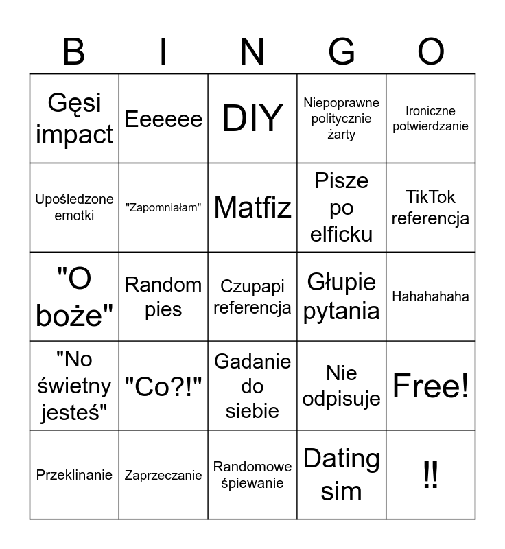 This bingo card has 26 words: Gadanie do siebie, Dating sim, Matfiz, Zaprzeczanie, Ironiczne potwierdzanie, Gęsi impact, Upośledzone emotki, Eeeeee, Hahahahaha, Nie odpisuje, Pisze po elficku, "O boże", Free!, Przeklinanie, Random pies, Anime referencje, Niepoprawne politycznie żarty, "No świetny jesteś", DIY, Czupapi referencja, TikTok referencja, Randomowe śpiewanie, Głupie pytania, "Co?!", "Zapomniałam" and ‼️.