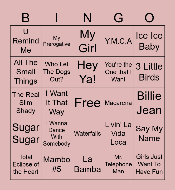 This bingo card has a free space and 24 words: I Wanna Dance With Somebody, Mambo #5, Hey Ya!, Total Eclipse of the Heart, Ice Ice Baby, U Remind Me, All The Small Things, My Prerogative, Macarena, Waterfalls, You’re the One that I Want, The Real Slim Shady, Livin’ La Vida Loca, Say My Name, Who Let The Dogs Out?, Mr. Telephone Man, Billie Jean, My Girl, 3 Little Birds, I Want It That Way, Girls Just Want To Have Fun, Sugar Sugar, Y.M.C.A and La Bamba.
