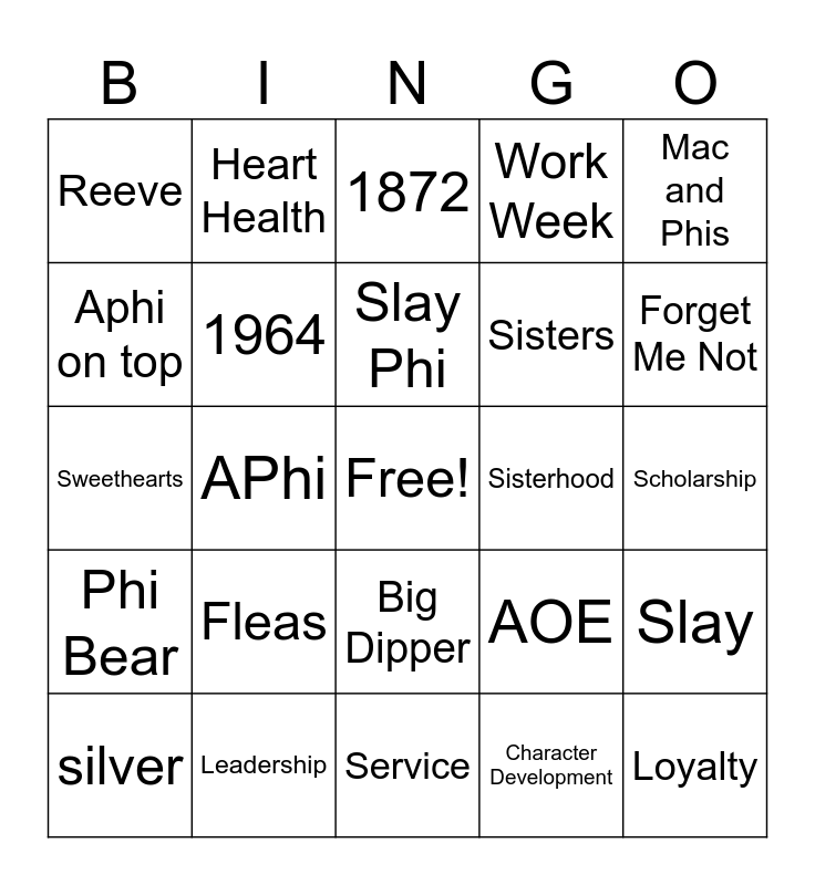 This bingo card has a free space and 29 words: silver, Bordeaux, APhi, Delta Pi, Reeve, 1872, 1964, Fleas, Sisterhood, Leadership, Scholarship, Loyalty, Service, Character Development, Forget Me Not, Ivy, Big Dipper, Phi Bear, Mac and Phis, Sweethearts, AOE, Lily of the Valley, Sisters, Aphi on top, Work Week, Heart Health, Slay, Slay Phi and Hot Grannies.