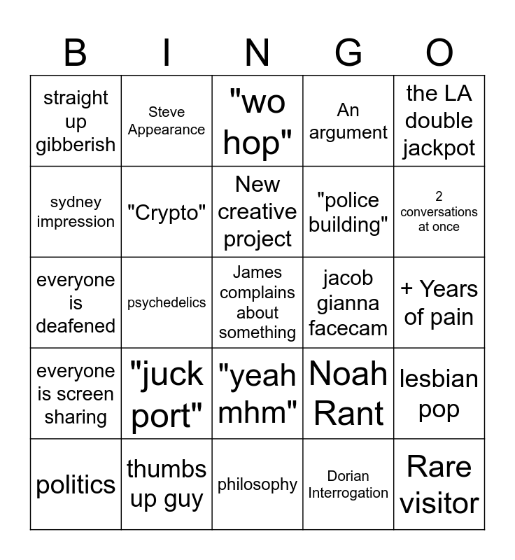 This bingo card has a free space and 24 words: "juck port", thumbs up guy, New creative project, politics, the LA double jackpot, straight up gibberish, sydney impression, Steve Appearance, jacob gianna facecam, "yeah mhm", "police building", everyone is deafened, Noah Rant, lesbian pop, "Crypto", Dorian Interrogation, + Years of pain, "wo hop", 2 conversations at once, psychedelics, Rare visitor, everyone is screen sharing, An argument and philosophy.