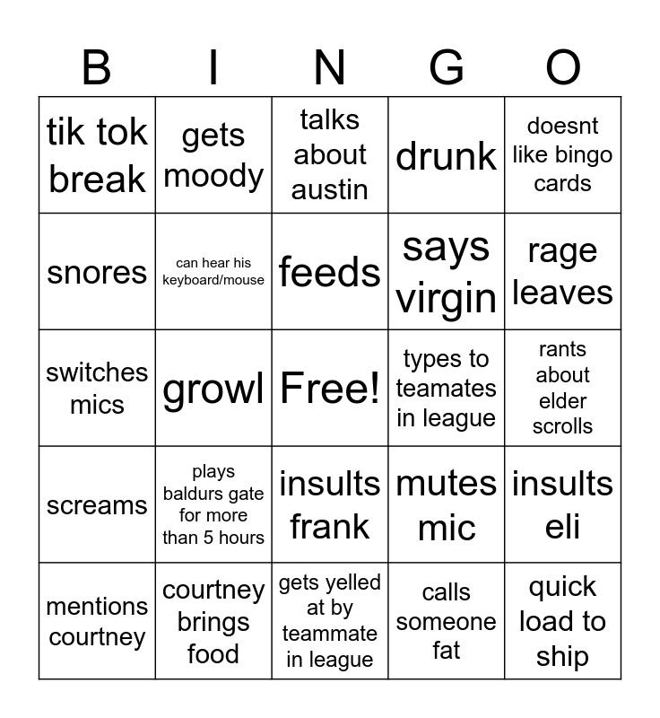 This bingo card has a free space and 24 words: mentions courtney, plays baldurs gate for more than 5 hours, feeds, calls someone fat, doesnt like bingo cards, tik tok break, gets moody, talks about austin, types to teamates in league, rants about elder scrolls, switches mics, can hear his keyboard/mouse, mutes mic, insults eli, snores, courtney brings food, gets yelled at by teammate in league, drunk, rage leaves, screams, growl, insults frank, says virgin and quick load to ship.