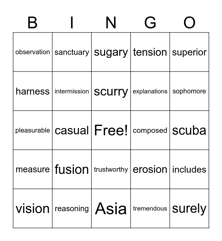 This bingo card has a free space and 24 words: fusion, reasoning, scurry, vision, superior, observation, harness, sanctuary, composed, trustworthy, explanations, pleasurable, erosion, includes, intermission, tremendous, scuba, sugary, sophomore, casual, surely, measure, tension and Asia.