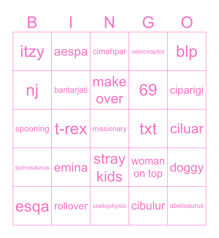 This bingo card has a free space and 24 words: emina, rollover, make over, esqa, blp, itzy, nj, aespa, txt, stray kids, 69, spooning, woman on top, doggy, bantarjati, cibulur, ciluar, cimahpar, ciparigi, t-rex, abelisaurus, spinosaurus, velociraptor and coelophysis.