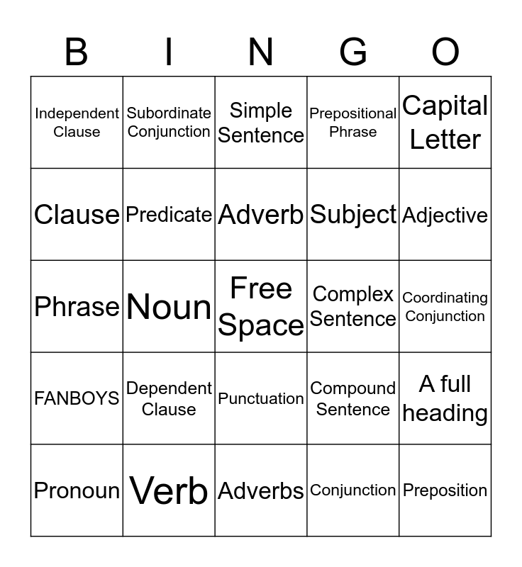 This bingo card has a free space and 24 words: Dependent Clause, Verb, Adverb, Pronoun, Capital Letter, Independent Clause, Clause, Subordinate Conjunction, Complex Sentence, Punctuation, Subject, Phrase, Compound Sentence, A full heading, Predicate, Conjunction, Coordinating Conjunction, Simple Sentence, Adjective, Noun, Preposition, FANBOYS, Prepositional Phrase and Adverbs.