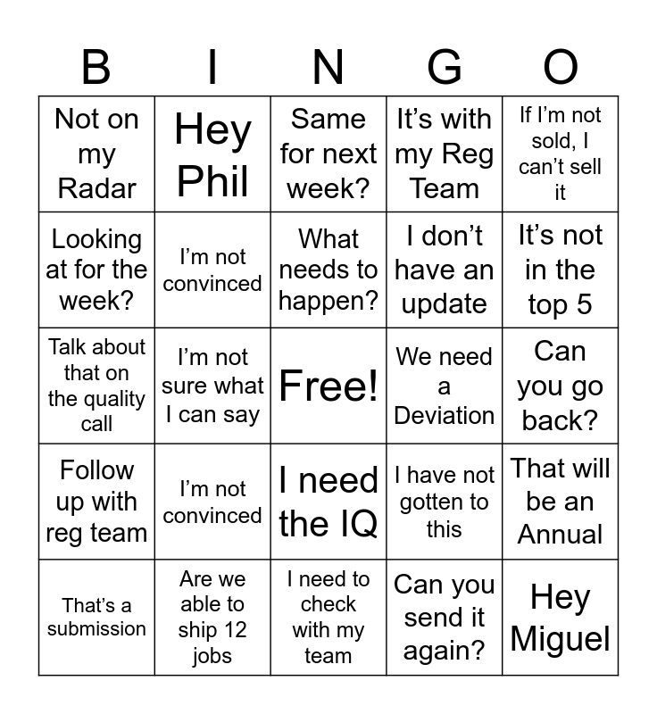 This bingo card has a free space and 28 words: That will be an Annual, It’s with Design, I don’t have an update, Can you send it again?, Looking at for the week?, Same for next week?, Hey Phil, Follow up with reg team, We need a Deviation, That’s a submission, Talk about that on the quality call, It’s with my Reg Team, Are we able to ship 12 jobs, I need to check with my team, It’s not in the top 5, 2 signatures left, I’m not convinced, I’m not convinced, What needs to happen?, I need the IQ, Not on my Radar, That’s a 30 day, Hey Miguel, I’m not sure what I can say, Can you go back?, I have not gotten to this, If I’m not sold, I can’t sell it and I don’t Have an Update.