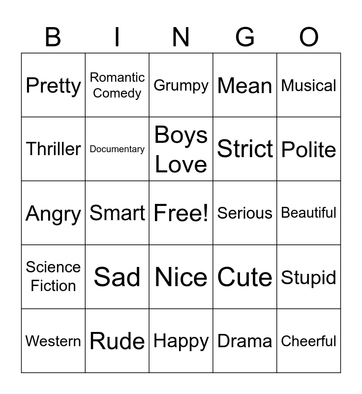 This bingo card has a free space and 34 words: Action, Drama, Comedy, Horror, Science Fiction, Documentary, Musical, Western, Romantic Comedy, Girls Love, Boys Love, Grumpy, Silly, Brave, Serious, Polite, Rude, Angry, Sad, Cute, Nice, Handsome, Pretty, Beautiful, Happy, Cheerful, Mean, Scary, Strict, Thriller, Loyal, Smart, Stupid and Weird.