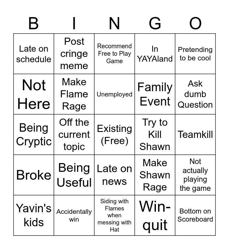 This bingo card has a free space and 24 words: Being Useful, Accidentally win, Unemployed, Yavin's kids, Pretending to be cool, Late on schedule, Not Here, Post cringe meme, Try to Kill Shawn, Late on news, Family Event, Being Cryptic, Make Shawn Rage, Not actually playing the game, Make Flame Rage, Win-quit, Teamkill, Recommend Free to Play Game, Ask dumb Question, Off the current topic, Bottom on Scoreboard, Broke, In YAYAland and Siding with Flames when messing with Hat.