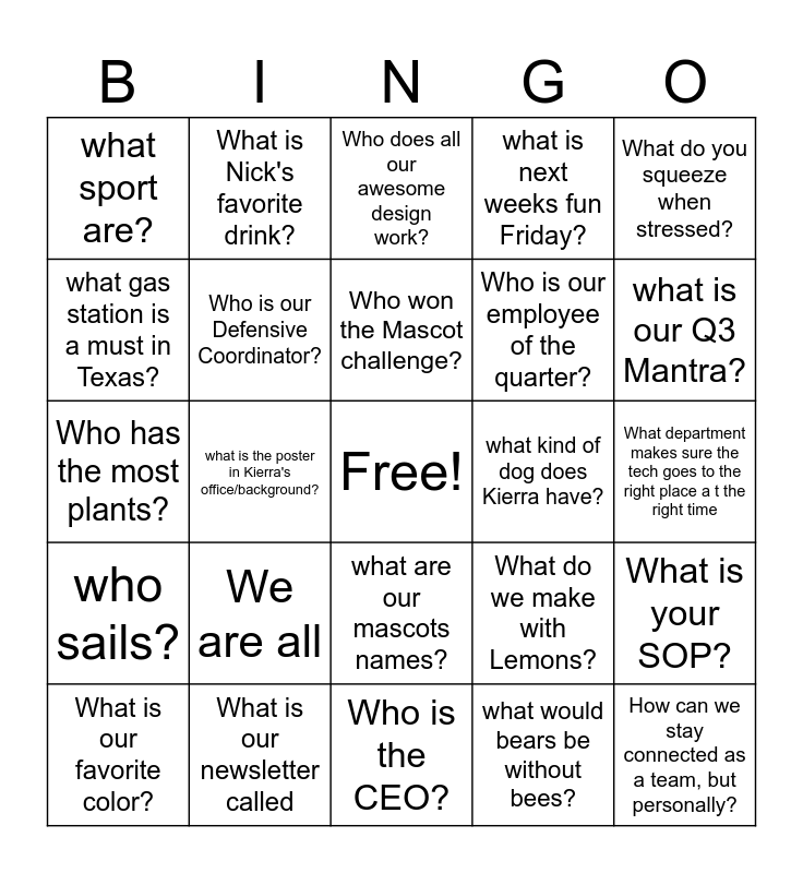 This bingo card has a free space and 25 words: We are all, Who is the CEO?, Who won the Mascot challenge?, What is our favorite color?, What do you squeeze when stressed?, what sport are?, what gas station is a must in Texas?, What is Nick's favorite drink?, what kind of dog does Kierra have?, what are our mascots names?, Who is our employee of the quarter?, Who has the most plants?, What do we make with Lemons?, What is your SOP?, Who is our Defensive Coordinator?, What department makes sure our techs can work?, What department makes sure the tech goes to the right place a t the right time, Who does all our awesome design work?, what is our Q3 Mantra?, what is the poster in Kierra's office/background?, How can we stay connected as a team, but personally?, What is our newsletter called, who sails?, what is next weeks fun Friday? and what would bears be without bees?.