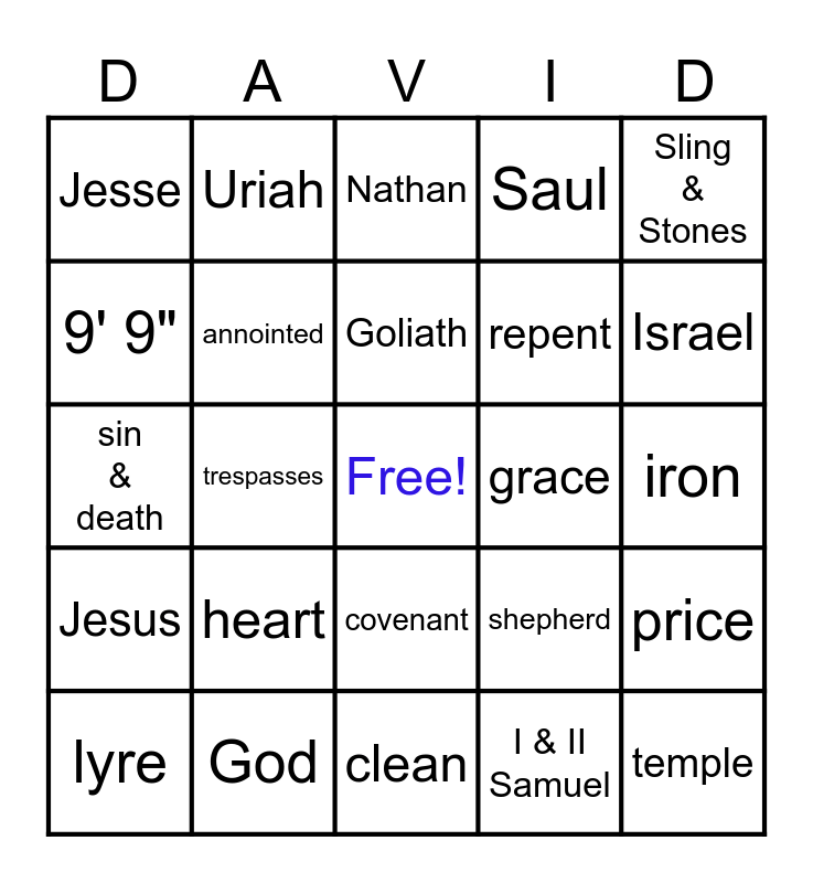 This bingo card has a free space and 24 words: heart, God, Goliath, lyre, Sling & Stones, Jesse, 9' 9", Uriah, grace, covenant, repent, sin & death, shepherd, price, annointed, I & II Samuel, iron, Nathan, Israel, trespasses, temple, Jesus, Saul and clean.