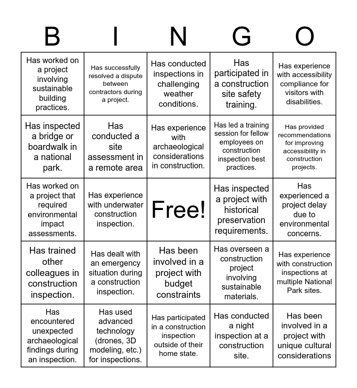 This bingo card has a free space and 35 words: Has inspected a historical building, Has worked on a trail maintenance project, Has experience with safety regulations on construction sites, Has conducted a site assessment in a remote area, Has been involved in a project with budget constraints, Has participated in a construction site safety training., Has inspected a bridge or boardwalk in a national park., Has encountered wildlife during a construction inspection., Has experience with archaeological considerations in construction., Has inspected a project involving renewable energy (e.g., solar panels, wind turbines)., Has worked on a project that required environmental impact assessments., Has experience with accessibility compliance for visitors with disabilities., Has inspected a construction project at a remote island or location., Has encountered unexpected challenges during a construction inspection., Has worked on a project involving sustainable building practices., Has inspected a project with historical preservation requirements., Has conducted a night inspection at a construction site., Has experience with underwater construction inspection., Has trained other colleagues in construction inspection., Has been involved in a project with unique cultural considerations, Has overseen a construction project involving sustainable materials., Has encountered unexpected archaeological findings during an inspection., Has experience with construction inspections at multiple National Park sites., Has used advanced technology (drones, 3D modeling, etc.) for inspections., Has conducted inspections in challenging weather conditions., Has provided recommendations for improving accessibility in construction projects., Has collaborated with multiple stakeholders (contractors, park rangers, local community) during inspections., Has been involved in a project related to wildlife protection during construction., Has led a training session for fellow employees on construction inspection best practices., Has experienced a project delay due to environmental concerns., Has worked on a construction project involving historical preservation., Has participated in a construction inspection outside of their home state., Has dealt with an emergency situation during a construction inspection., Has successfully resolved a dispute between contractors during a project. and Has conducted inspections for a project aimed at improving energy efficiency..