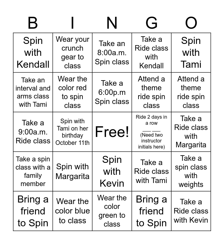 This bingo card has a free space and 24 words: Spin with Margarita, Wear the color blue to class, Take a 6:00p.m Spin class, Bring a friend to Spin, Spin with Tami, Spin with Kendall, Take an interval and arms class with Tami, Wear your crunch gear to class, Ride 2 days in a row ___ ___ (Need two instructor initials here), Spin with Kevin, Attend a theme ride spin class, Take a 9:00a.m. Ride class, Take a Ride class with Tami, Take a spin class with weights, Wear the color red to spin class, Bring a friend to Spin, Take a Ride class with Margarita, Take an 8:00a.m. Spin class, Attend a theme ride spin class, Spin with Tami on her birthday October 11th, Take a Ride class with Kevin, Take a spin class with a family member, Take a Ride class with Kendall and Wear the color green to class.