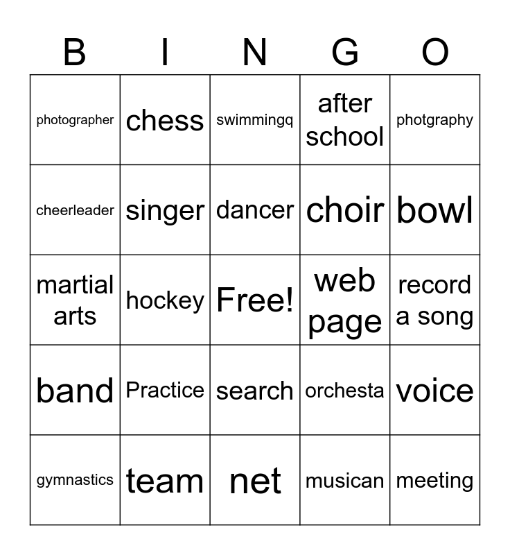 This bingo card has a free space and 24 words: Practice, team, dancer, gymnastics, photgraphy, photographer, cheerleader, chess, web page, search, choir, martial arts, orchesta, voice, singer, musican, record a song, swimmingq, bowl, hockey, meeting, band, after school and net.