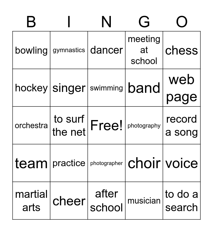 This bingo card has a free space and 24 words: practice, cheer, swimming, martial arts, chess, bowling, hockey, gymnastics, photography, photographer, band, orchestra, choir, voice, singer, musician, record a song, dancer, web page, to surf the net, to do a search, team, meeting at school and after school.