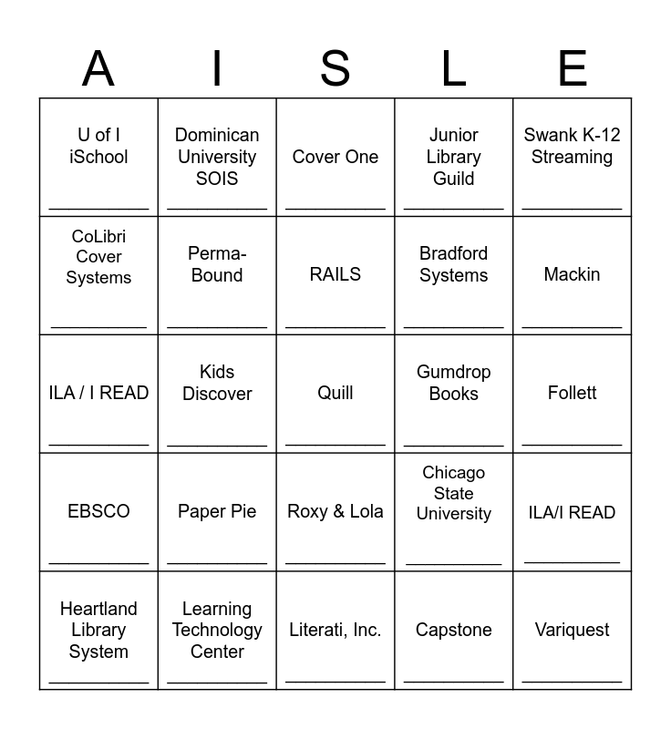 This bingo card has 28 words: ILA/I READ __________, LBSS __________, Bradford Systems __________, Capstone __________, CoLibri Cover Systems __________, Cover One __________, Dominican University SOIS __________, EBSCO __________, Gumdrop Books __________, Heartland Library System __________, ILA / I READ __________, Junior Library Guild __________, Learning Technology Center __________, Literati, Inc. __________, Mackin __________, Sora by OverDrive __________, Paper Pie __________, Perma-Bound __________, RAILS __________, Roxy & Lola __________, U of I iSchool __________, Variquest __________, Quill __________, Kids Discover __________, Follett __________, Chicago State University __________, Swank K-12 Streaming __________ and AISLE Store __________.