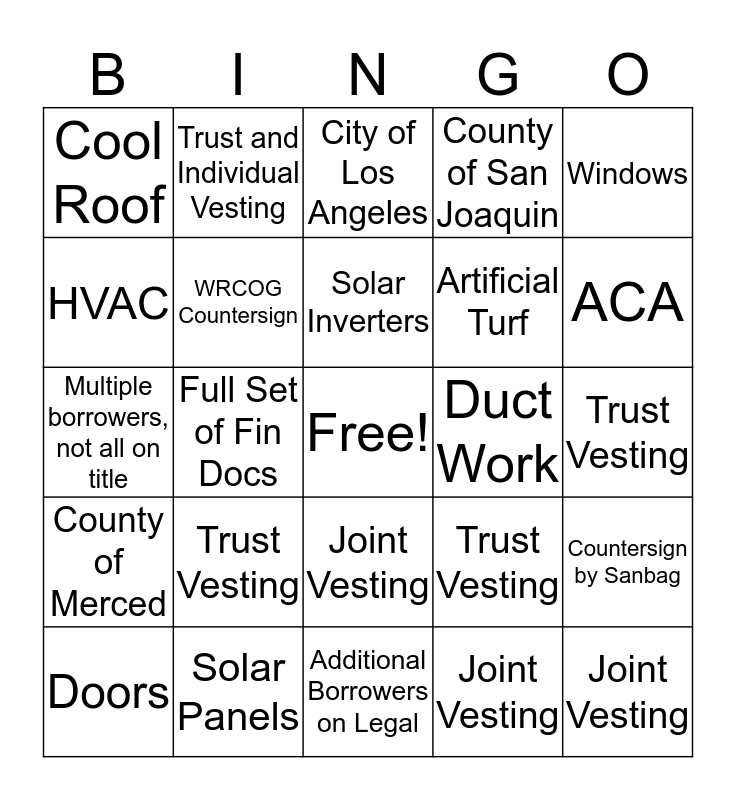 This bingo card has a free space and 24 words: Trust Vesting, Solar Panels, Solar Inverters, Doors, Windows, Cool Roof, HVAC, Trust and Individual Vesting, Duct Work, Joint Vesting, Artificial Turf, Multiple borrowers, not all on title, Trust Vesting, Countersign by Sanbag, WRCOG Countersign, Joint Vesting, Trust Vesting, City of Los Angeles, ACA, Full Set of Fin Docs, Joint Vesting, County of Merced, County of San Joaquin and Additional Borrowers on Legal.