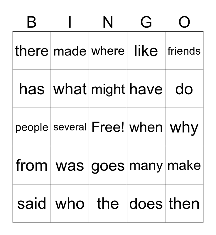 This bingo card has a free space and 29 words: said, something, several, someone, there, where, what, was, when, who, why, then, the, does, do, like, goes, from, friends, people, many, how, have, has, like, made, make, might and saw.