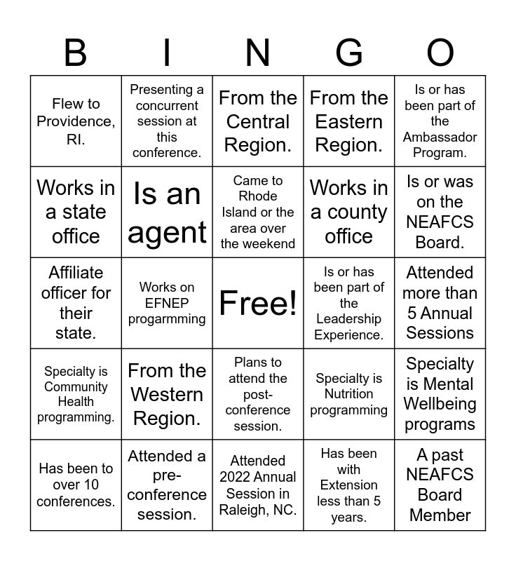 This bingo card has a free space and 45 words: Drove to the 2023 Annual Session, A past NEAFCS Board Member, A first time attendee to Annual Session, Has been to over 10 conferences., Has been a member of a conference planning committee., Has been with Extension less than 5 years., From the Central Region., From the Southern Region., Is or has been part of the Ambassador Program., Attended a pre-conference session., From the Eastern Region., Is or has been part of the Leadership Experience., Plans to attend the post-conference session., From the Western Region., A Lifetime member of NEAFCS., Attended 2022 Annual Session in Raleigh, NC., Attending an in-depth session., Affiliate officer for their state., On a NEAFCS committee., Is or was on the NEAFCS Board., Presenting a concurrent session at this conference., Attended a pre-conference session, Has been with Extension more than 10 years, Flew to Providence, RI., Is receiving an award., Attended more than 5 Annual Sessions, Attending States Night Out with their state., Visiting Rhode Island for the first time, Specialty is Nutrition programming, Specialty is Community Health programming., Specialty is Financial programs, Specialty is Mental Wellbeing programs, Specialty is food safety, Specialty is physical activity, Works in SNAP-Ed, Works on EFNEP progarmming, Is a Program Leader, Has been with Extension 6 - 10 years, Is extending their stay in Rhode Island, Came to Rhode Island or the area over the weekend, Works in a state office, Works in a county office, Is a specialist, Is an agent and Is a PI on a grant.