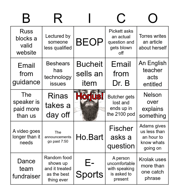 This bingo card has a free space and 36 words: Price gets angry, Johansen is in dress code, Moss is late to meeting, Beshears has technology issues, Fischer asks a question, A video goes longer than it needs, Bucheit sells an item, A teacher uses the PA system, Torres writes an article about herself, Bartsch answers her own question, Rinas takes a day off, Pickett asks an actual question and gets blown off, Leto's alarm goes off, Butcher gets lost and ends up in the 2100 pod, An English teacher acts entitled, Russ blocks a valid website, Admin is out of dresscode, The announcements go past 7:50, Krolak uses more than one catch phrase, BEOP, Nelson over explains something, Adams gives us less than an hour to know whats going on, Random food shows up and it treated as the best thing ever, Dance team fundraiser, E-Sports, Lectured by someone less qualified, The speaker is paid more than us, Dr. B speaks last, Email from Dr. B, Email from guidance, An honor goes to somebody that doesn't teach real classes, AI, A person uncomfortable with speaking is asked to present, Ho.Bart, Jon Mock and Tim Krieg.