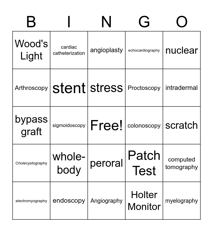 This bingo card has a free space and 27 words: Patch Test, Positron Emission, Proctoscopy, Angiography, Arthroscopy, angioplasty, cardiac catheterization, Cholecystography, colonoscopy, computed tomography, bypass graft, echocardiography, electromyography, endoscopy, intradermal, resonance, stent, stress, whole-body, Wood's Light, scratch, Holter Monitor, sigmoidoscopy, myelography, peroral, nuclear and Doppler.