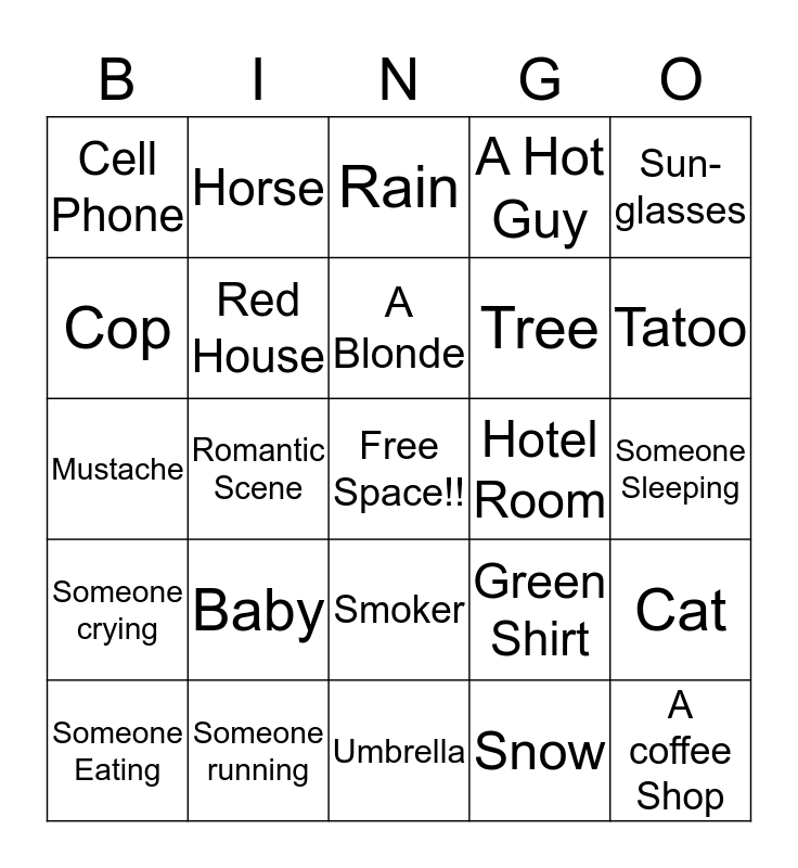 This bingo card has a free space and 37 words: Bike, An Affair, Bow Tie, Red House, Cat, Baby, A Blonde, Bald head, Sun- glasses, Cowboy Hat, Romantic Scene, A Hot Guy, A coffee Shop, Someone Sleeping, Cop, Someone crying, Black Dress, Rain, Smoker, Hotel Room, Cell Phone, Tatoo, Someone Eating, Umbrella, Dog, Snow, Horse, Someone singing, Kiss, The beach, Stop Sign, Someone running, Mustache, Beard, Green Shirt, Tree and A Fight.